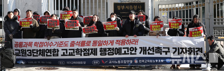 [서울=뉴시스] 김선웅 기자 = 교원3단체(교사노동조합연맹, 전국교직원노동조합, 한국교원단체총연합회)가 13일 서울 종로구 정부서울청사 앞에서 기자회견을 열고 고교학점제 행정예고안에 대해 출석률 중심 이수 기준 설정, 기초학력 별도 지원 체계 구축, 진로선택 및 융합선택 과목 절대평가 적용 등을 촉구하고 있다. 2026.01.13. [email protected]