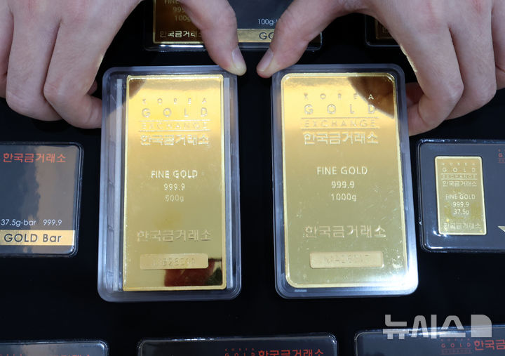 [서울=뉴시스] 이영환 기자 = 13일 오전 서울 종로구 한국금거래소에서 직원이 골드바를 선보이고 있다.