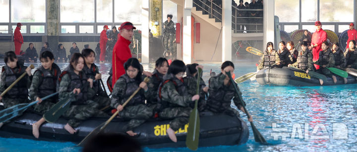 [포항=뉴시스] 이무열 기자 = 13일 경북 포항시 해병대 1사단 인천상륙관에서 열린 ‘2026 겨울 해병대 캠프’에서 참가자들이 이함 훈련을 하고 있다. 2026.01.13. [email protected]