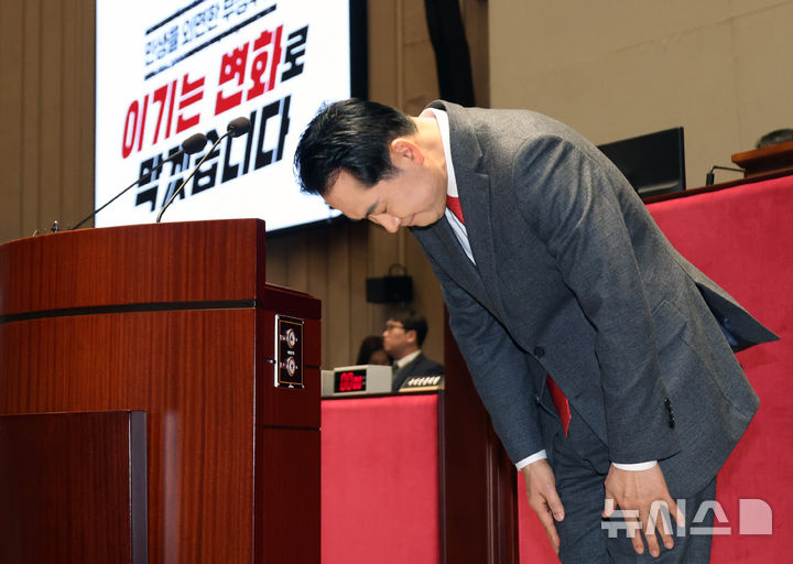[서울=뉴시스] 김금보 기자 = 장동혁 국민의힘 대표가 13일 오후 서울 여의도 국회에서 열린 국회의원-당협위원장 연석회의 및 의원총회에서 인사를 하고 있다. 2026.01.13. [email protected]