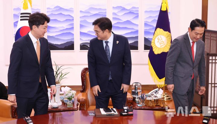 [서울=뉴시스] 조성봉 기자 = 우원식 국회의장이 13일 오후 서울 여의도 국회의장 집무실에서 2차특검법 등 법안처리 관련 항의방문을 온 장동혁 국민의힘 대표, 이준석 개혁신당 대표와 기념촬영을 마치고 자리에 앉고 있다. 2026.01.13. [email protected]