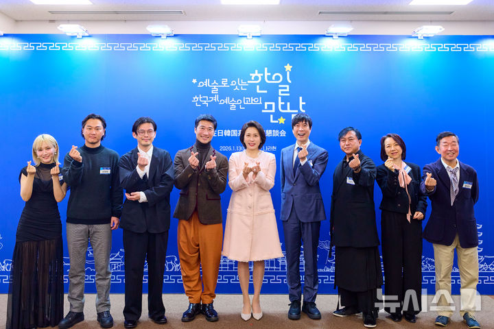 [나라=뉴시스] 고범준 기자 = 김혜경 여사가 13일(현지 시간) 일본 나라현의 한 호텔에서 열린 재일 한국계 예술인 간담회에서 참석자들과 기념촬영을 하고 있다. (공동취재) 2026.01.13. [email protected]