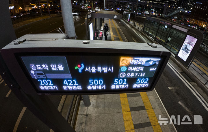 [서울=뉴시스] 김근수 기자 = 퇴근길에도 서울 시내버스 파업이 계속되는 13일 저녁 서울 중구 서울역 버스환승센터 정류장 전광판에 버스 출발 대기 안내문구가 나오고 있다. 2026.01.13. [email protected]