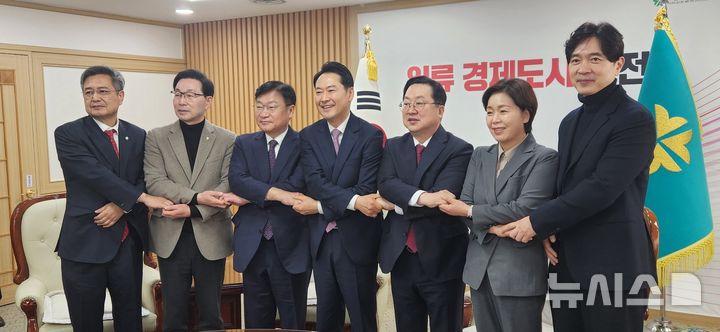 [대전=뉴시스]곽상훈 기자=국민의힘 장동혁 대표와 지도부가 14일 대전시청에서 이장우 대전시장을 만나 대전충남 행정통합과 당 현안에 대해 논의 전 기념촬영을 하고 있다. 이 자리에는 정점식 정책위의장, 김장겸 당 대표 정무실장, 박성훈 수석대변인, 박준태 당 대표 비서실장, 함인경 대변인 등이 참석했다. 2025. 01. 14 [email protected]