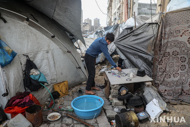 [가자시티=신화/뉴시스] 13일(현지 시간) 가자지구 가자시티 난민 천막촌에서 팔레스타인 소년이 폭풍으로 흩어진 세간살이를 정리하고 있다. 이날 폭우와 강풍으로 가자시티에서 4명이 사망했다. 2026.01.14.