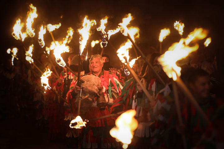 [돌나 세키르나=AP/뉴시스] 13일(현지 시간) 불가리아 돌나 세키르나 마을에서 방울을 목에 건 주민이 모닥불 주변에서 춤을 추며 고대 수르바(Surva) 의식을 행하고 있다. 이 의식은 율리우스력 새해를 맞아 악령을 쫓고 구성원들의 건강·다산·번영을 기원하는 전통 의식이다. 2026.01.14.