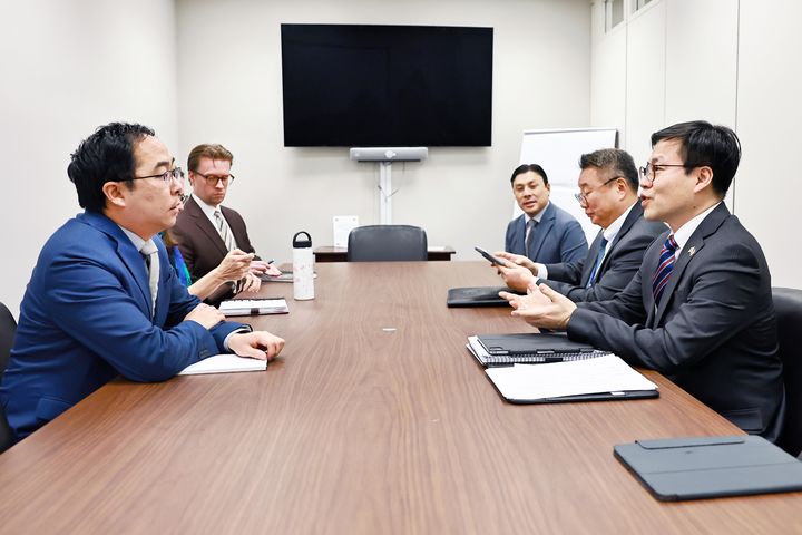 [서울=뉴시스] 여한구 산업통상부 통상교섭본부장이 13일(현지 시간) 미국 워싱턴 D.C. 의회에서 앤디 킴 상원의원과 면담하고 있다. (사진=산업통상부 제공) 2026.01.14. [email protected] *재판매 및 DB 금지