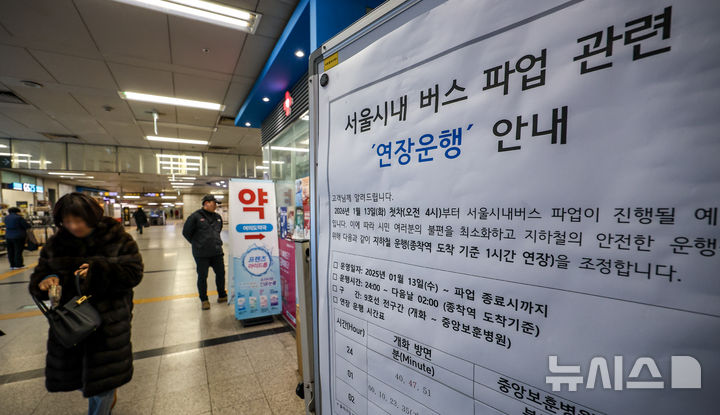 [서울=뉴시스] 정병혁 기자 = 서울 시내버스 파업이 이어지고 있는 14일 서울 영등포구 여의도역에 서울시내 버스 파업 관련 지하철 연장운행 안내문이 붙어 있다. .2026.01.14. [email protected]
