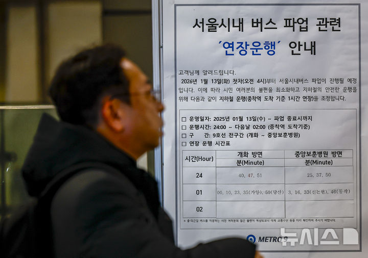 [서울=뉴시스] 정병혁 기자 = 서울 시내버스 파업이 이어지고 있는 14일 서울 영등포구 여의도역에 서울시내 버스 파업 관련 지하철 연장운행 안내문이 붙어 있다. .2026.01.14. [email protected]