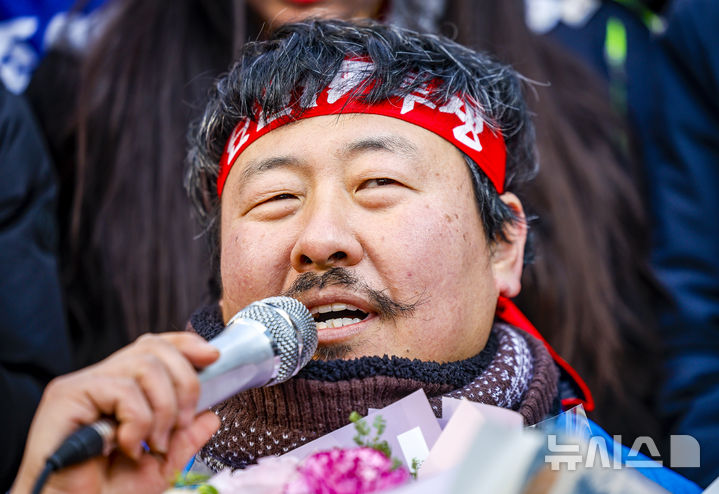 [서울=뉴시스] 정병혁 기자 = 세종호텔 해고 노동자의 복직을 요구하며 336일 째 고공농성 중인 고진수 민주노총 서비스연맹 세종호텔지부장이 14일 서울 중구 세종호텔 앞 공공농성장에서 고공농성을 해제하고 지상으로 내려와 발언하고 있다. 2026.01.14. [email protected]