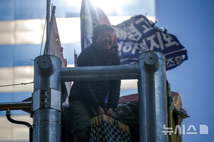 [서울=뉴시스] 정병혁 기자 = 세종호텔 해고 노동자의 복직을 요구하며 336일 째 고공농성 중인 고진수 민주노총 서비스연맹 세종호텔지부장이 14일 서울 중구 세종호텔 앞 공공농성장에서 고공농성을 해제하고 지상으로 내려올 준비를 하며 웃고 있다. 2026.01.14. [email protected]