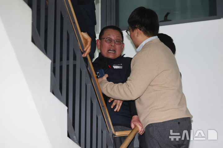 [서울=뉴시스] 황준선 기자 = 14일 서울 영등포구 서울지방노동위원회에서 열린 특별조조위원회 2차 사후 조정회의에서 박점곤 서울시버스노동조합 위원장이 회의장을 나서자 회의 관계자들이 이를 만류하고 있다. 2026.01.14. [email protected]