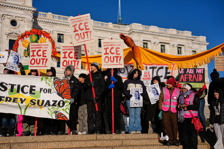 [세인트폴=AP/뉴시스] 14일(현지 시간) 미 미네소타주 세인트폴에 있는 주 의사당 앞에서 시위대가 지난 7일 이민·세관단속국(ICE) 요원의 총격으로 사망한 르네 굿 사건에 항의하고 있다. 2026.01.15.