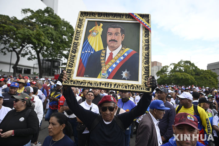 [카라카스=신화/뉴시스] 14일(현지 시간) 베네수엘라 카라카스에서 시민과 노동자들이 미국에 억류 중인 니콜라스 마두로 전 대통령 부부의 석방을 요구하며 행진하고 있다. 2026.01.15.