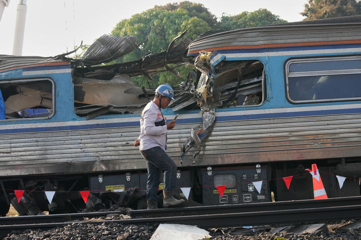 [나콘랏차시마=AP/뉴시스] 15일(현지 시간) 태국 나콘랏차시마주 시키우에서 발생한 크레인-열차 사고 현장에서 한 관계자가 열차 잔해를 살피고 있다. 전날 고속철 건설 현장의 크레인이 달리던 열차에 추락하는 사고가 발생해 지금까지 희생자 숫자는 한국인 1명 포함, 최소 32명으로 늘어났다. 2026.01.15.