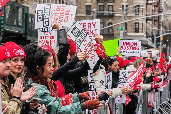 [뉴욕=AP/뉴시스] 14일(현지 시간) 미국 뉴욕 마운트 시나이 병원 앞에서 파업 중인 간호사들이 시위하고 있다. 3일째 시위를 이어가는 간호사들은 임금 인상, 인력 충원, 작업장 안전 강화 등을 요구하고 있지만, 노사 간 협상은 교착 상태인 것으로 알려졌다. 2026.01.15.