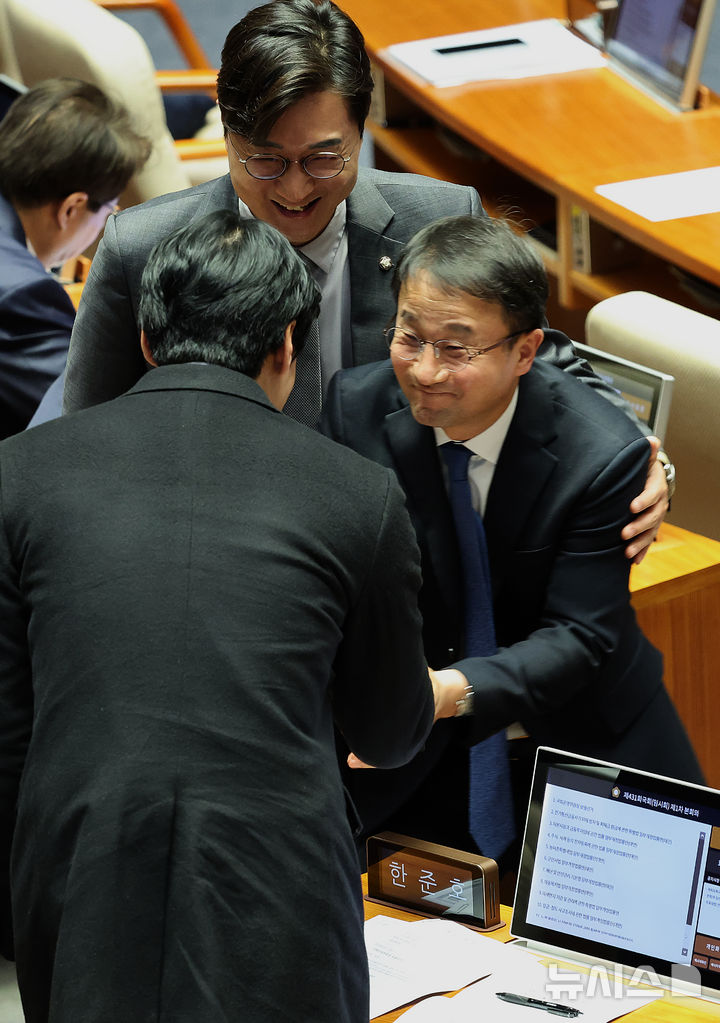 [서울=뉴시스] 김금보 기자 = 한병도 더불어민주당 원내대표가 15일 오후 서울 여의도 국회에서 열린 제431회국회(임시회) 제1차 본회의에서 의원들과 인사를 하고 있다. 2026.01.15. [email protected]
