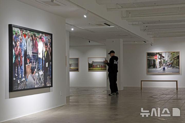 [서울=뉴시스] 박진희 기자 = 사진작가로 변신한 박용만 전 두산그룹 회장의 장남 박서원이 15일 서울 중구 피크닉에서 열린 박용만 사진전 'HUMAN MOMENT' 전시 작품을 돌아보고 있다. 2026.01.15. [email protected]