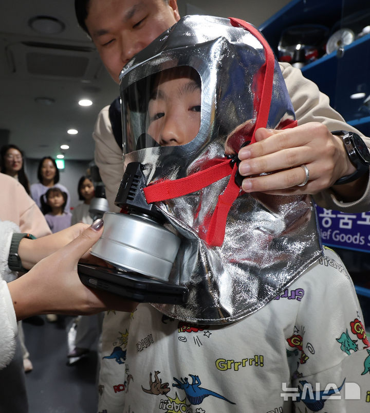 [인천=뉴시스] 전진환 기자 = 겨울방학을 맞은 초등학교 어린이들이 15일 오후 인천 남동구 인천시교육청학생안전체험관에서 지하철 화재 대피 마스크 체험을 하고 있다. 2026.01.15. [email protected]
