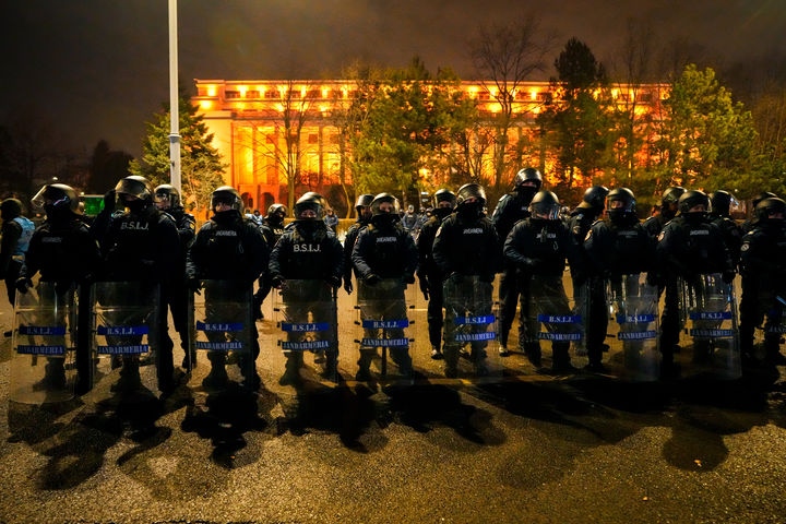 정부 청사 앞에서 시위대와 대치한 루마니아 경찰