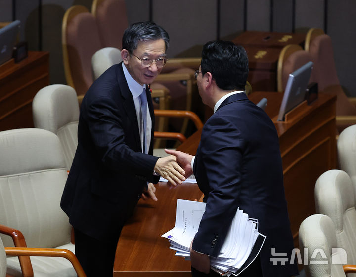 [서울=뉴시스] 김금보 기자 = 정성호 법무부 장관이 16일 오전 서울 여의도 국회에서 열린 본회의에서 '2차 종합특검법' 반대 무제한토론을 마친 천하람 개혁신당 원내대표와 악수를 하고 있다. 2026.01.16. [email protected]