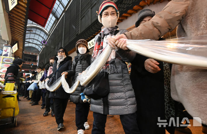 [수원=뉴시스] 김종택 기자 = 16일 경기 수원시 팔달구 못골시장에서 열린 '못골시장과 함께하는 가래떡 나눔 행사'에 참석한 시장상인과 시민들이 180m 길이의 가래떡을 이어잡는 퍼포먼스를 하고 있다. 2026.01.16. [email protected]