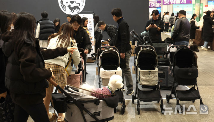 [고양=뉴시스] 전진환 기자 = 16일 오후 경기도 고양시 킨텍스에서 열린 마이펫페어 2026을 찾은 관람객들이 반려견용 개모차를 살펴보고 있다.  2026.01.16. [email protected]