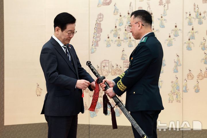 [서울=뉴시스] 고범준 기자 = 이재명 대통령이 16일 청와대 본관에서 열린 3성 장군 진급·보직 신고 및 수치 수여식에서 이상렬 육군 3군단장의 삼정검에 수치를 달아주고 있다. 2026.01.16. [email protected]