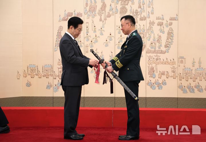 [서울=뉴시스] 고범준 기자 = 이재명 대통령이 16일 청와대 본관에서 열린 3성 장군 진급·보직 신고 및 수치 수여식에서 이상렬 육군 3군단장의 삼정검에 수치를 달아주고 있다. 2026.01.16. [email protected]