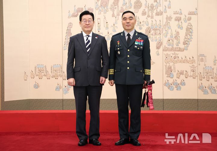 [서울=뉴시스] 고범준 기자 = 이재명 대통령이 16일 청와대 본관에서 열린 3성 장군 진급·보직 신고 및 수치 수여식에서 김종묵 지상작전사령부참모장의 삼정검에 수치를 달아준 후 기념촬영 하고 있다. 2026.01.16. [email protected]