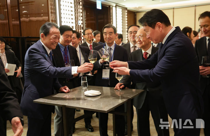 [서울=뉴시스] 황준선 기자 = 아소 다로(왼쪽) 전 일본 총리와 최태원 SK그룹 회장이 16일 오후 서울 중구 웨스틴 조선호텔에서 열린 제16차 서울-도쿄포럼에서 건배하고 있다. 2026.01.16. [email protected]