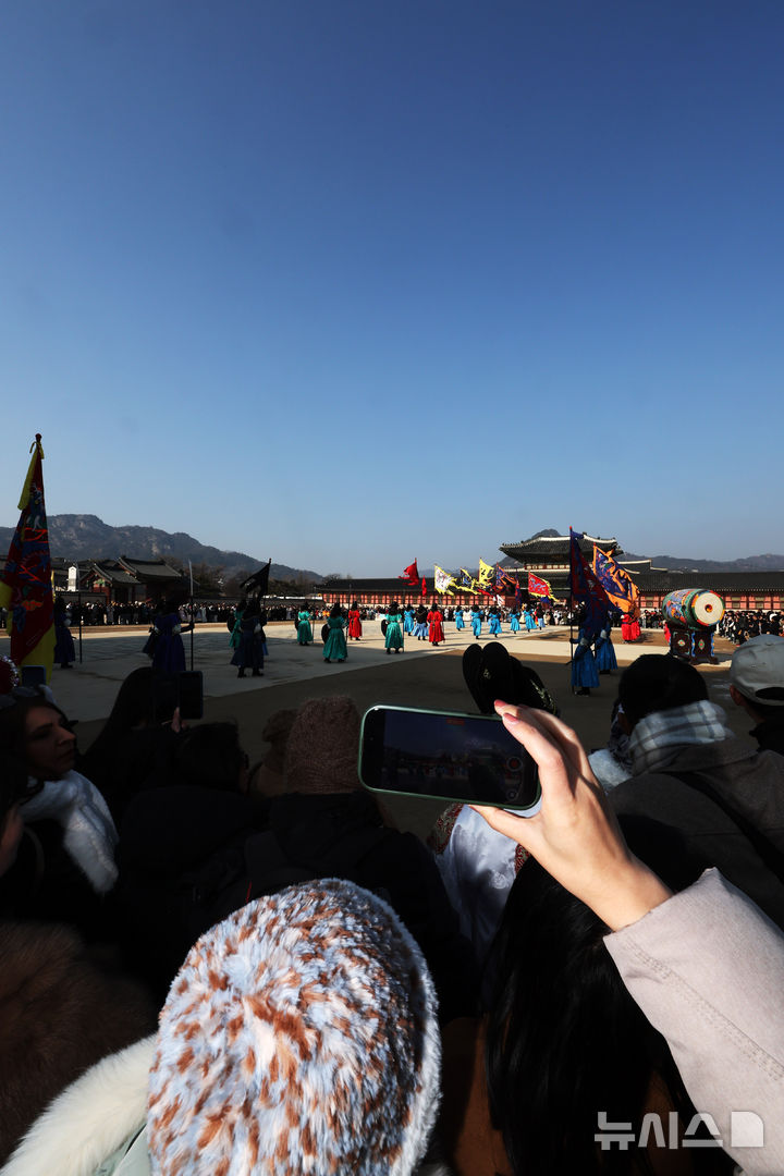 [서울=뉴시스] 배훈식 기자 = 북서풍의 영향으로 미세먼지 농도가 보통 수준을 보인 17일 오후 서울 종로구 경복궁을 찾은 여행객들이 파란하늘 아래 수문장 교대의식을 관람하고 있다. 2026.01.17. [email protected]