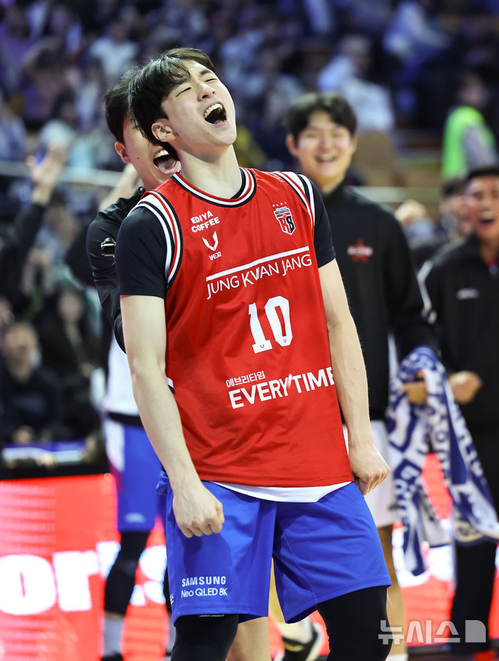 [서울=뉴시스] 최진석 기자 = 17일 서울 송파구 잠실실내체육관에서 열린 2025~2026시즌 LG전자 프로농구 올스타전 전야제 스포츠일러스트레이티드 덩크 콘테스트, 삼성 조준희가 부상으로 출전하지 못한 아반도의 유니폼을 입고 덩크 성공 후 기뻐하고 있다. 2026.01.17. [email protected]