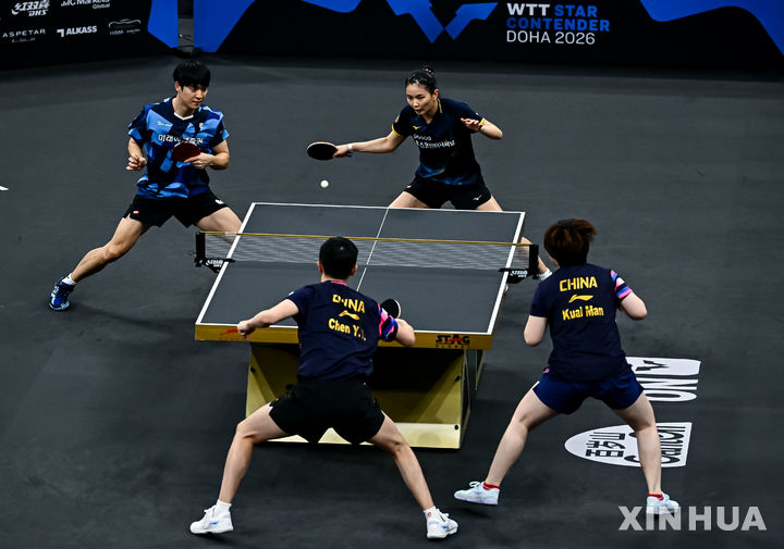 [도하=신화/뉴시스] 박강현-김나영 조(위)가 17일(현지 시간) 카타르 도하에서 열린 월드테이블테니스(WTT) 스타 컨텐더 도하 2026 혼합복식 준결승에서 천위안위-콰이만 조(중국)와 경기하고 있다. 박강현-김나영이 3-1(11-9 11-5 6-11 11-5)로 승리하고 결승에 올라 웡춘팅-두호이켐 조(홍콩)와 우승을 다툰다. 2026.01.18.