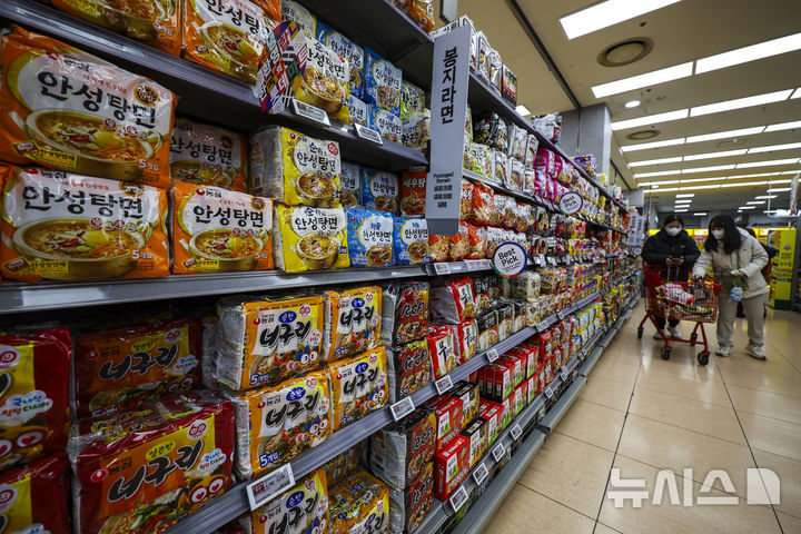 [서울=뉴시스] 정병혁 기자 = 18일 서울시내 대형마트에 라면이 진열되어 있다.