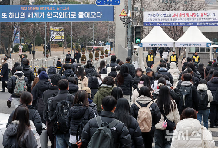 [서울=뉴시스] 조성우 기자 = 한국외국어대학교 2026학년도 편입학 필기고사를 치르는 수험생들이 18일 오후 서울 동대문구 한국외국어대학교 서울캠퍼스에서 고사장으로 향하고 있다. 2026.01.18. [email protected]