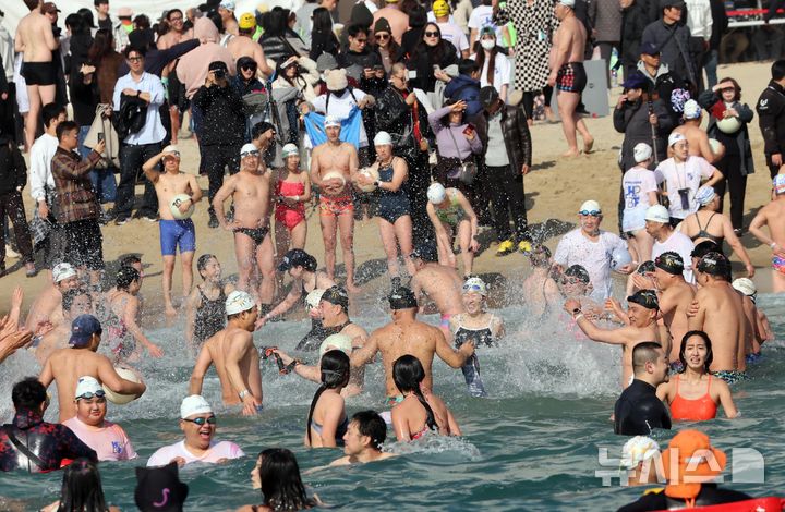 [부산=뉴시스] 하경민 기자 = '제39회 해운대 북극곰축제'가 열린 18일 부산 해운대구 해운대해수욕장에서 시민과 관광객 등 인간 북극곰들이 일제히 차가운 겨울바다에 뛰어들고 있다. 2026.01.18. [email protected]