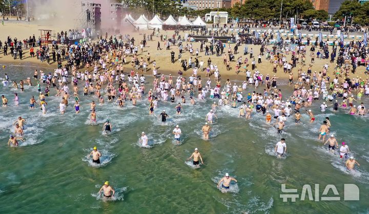 [부산=뉴시스] 하경민 기자 = '제39회 해운대 북극곰축제'가 열린 18일 부산 해운대구 해운대해수욕장에서 시민과 관광객 등 인간 북극곰들이 일제히 차가운 겨울바다에 뛰어들고 있다. (사진=부산일보 제공) 2026.01.18. [email protected]