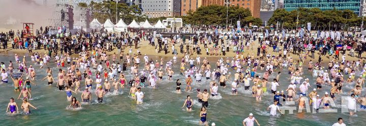 [부산=뉴시스] 하경민 기자 = '제39회 해운대 북극곰축제'가 열린 18일 부산 해운대구 해운대해수욕장에서 시민과 관광객 등 인간 북극곰들이 일제히 차가운 겨울바다에 뛰어들고 있다. (사진=부산일보 제공) 2026.01.18. [email protected]