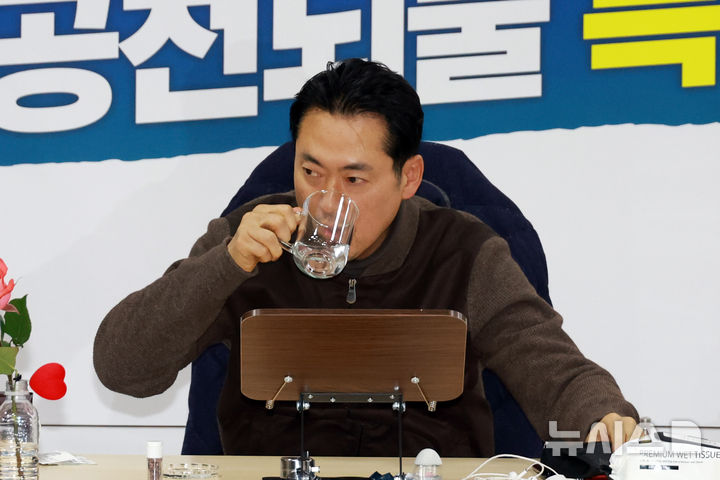 [서울=뉴시스] 고승민 기자 = 단식투쟁 4일차를 맞은 장동혁 국민의힘 대표가 18일 서울 여의도 국회 로텐더홀에서 물을 마시고 있다. 2026.01.18. [email protected]