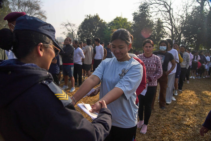 [카트만두=AP/뉴시스] 19일(현지 시간) 네팔 카트만두에서 총선을 앞두고 실시된 임시 경찰 채용 선발 시험에 응시한 지원자들이 체력 검사에 앞서 가시적인 문신·흉터 유무를 검사받고 있다. 네팔은 오는 3월 5일 총선을 치른다. 2026.01.19.