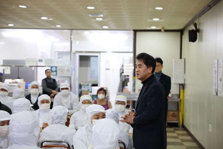 [보은=뉴시스] 최재형 충북 보은군수가 19일 오전 보은군 삼승면 김치제조기업 ㈜이킴을 방문해 직원들을 격려하고 있다. 최 군수는 지난해 화재로 피해입은 제조현장 상황을 점검하고 경영 정상화 방안을 논의했다. (사진=보은군 제공) 2026.01.19. [email protected]
