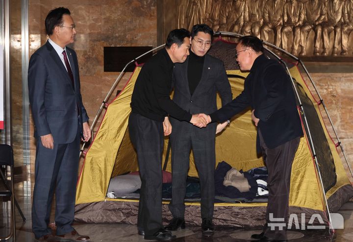 [서울=뉴시스] 조성봉 기자 = 장동혁 국민의힘 대표가 19일 오전 서울 여의도 국회 로텐더홀에서 '민주당의 공천 뇌물·통일교 게이트 특검 수용'을 촉구하며 단식농성 중 동조단식에 들어간 김재원 최고위원과 악수를 하고 있다. 2026.01.19. [email protected]