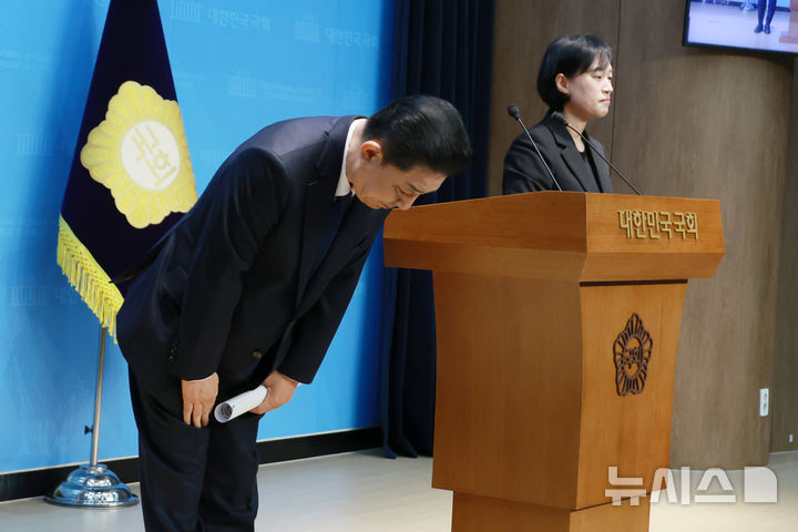 [서울=뉴시스] 고승민 기자 = 김병기 더불어민주당 전 원내대표가 19일 서울 여의도 국회 소통관에서 기자회견을 하던 중 고개숙여 인사하고 있다. 2026.01.19. [email protected]