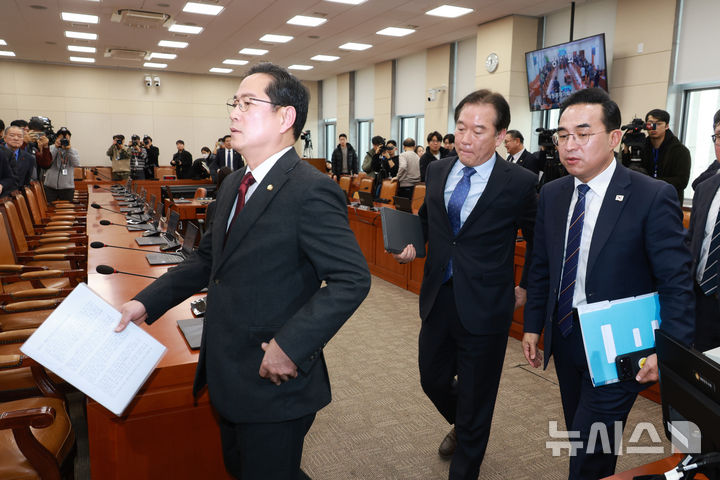[서울=뉴시스] 고승민 기자 = 국회 재정경제기획위원회 정태호 더불어민주당, 박수영 국민의힘 간사 등 의원들이 19일 서울 여의도 국회에서 열린 전체회의가 정회되자 회의장을 나서고 있다. 2026.01.19. [email protected]