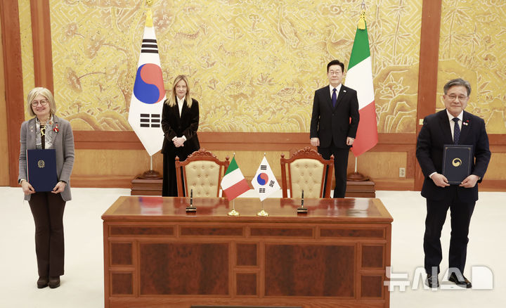 [서울=뉴시스] 최동준 기자 = 허민 국가유산청장과 에밀리아 가또 주한이탈리아대사가 19일 청와대에서 이재명 대통령과 조르자 멜로니 이탈리아 총리가 임석한 가운데 문화유산 및 경관 협력 양해각서를 체결한 뒤 기념촬영을 하고 있다. 2026.01.19. [email protected]