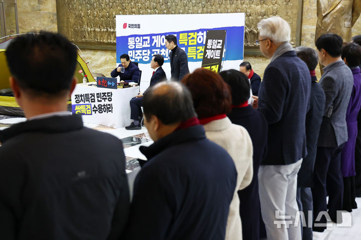 [서울=뉴시스] 김명년 기자 = 통일교·공천헌금 '쌍특검'을 요구하며 닷새째 단식을 진행 중인 장동혁 국민의힘 대표가 19일 오후 서울 여의도 국회 로텐더홀에서 농성을 이어가고 있다. 2026.01.19. [email protected]