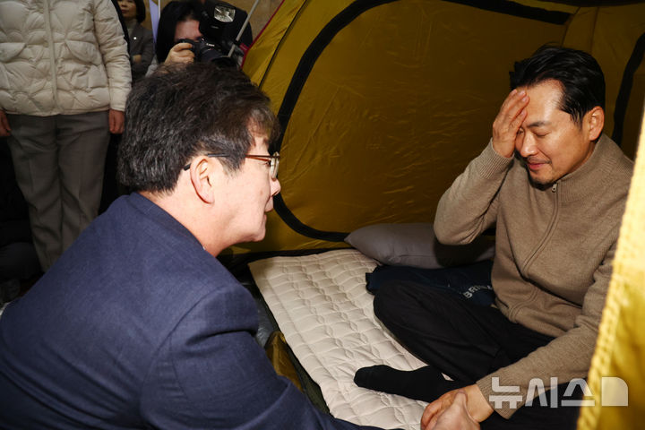 [서울=뉴시스] 김명년 기자 = 통일교·공천헌금 '쌍특검'을 요구하며 닷새째 단식을 진행 중인 장동혁 국민의힘 대표가 19일 오후 서울 여의도 국회 로텐더홀에 마련된 농성장에서 지지자들에게 인사하고 있다. 2026.01.19. [email protected]