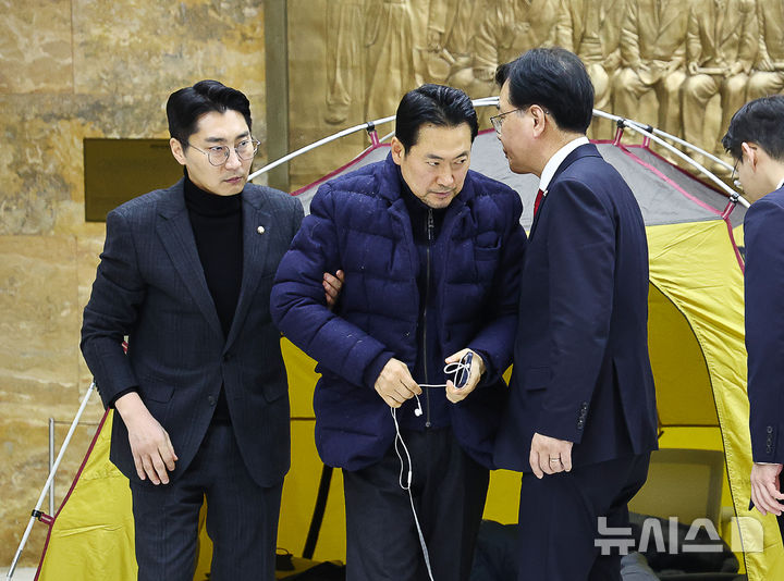 [서울=뉴시스] 김명년 기자 = 통일교·공천헌금 '쌍특검'을 요구하며 닷새째 단식을 진행 중인 장동혁 국민의힘 대표가 19일 오후 서울 여의도 국회 로텐더홀에서 송언석 원내대표와 박준태 당대표 비서실장의 부축을 받으며 이동하고 있다. 2026.01.19. [email protected]