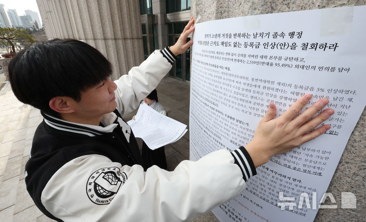 [서울=뉴시스] 황준선 기자 = 한국외대 총학생회 소속 학생들이 19일 오후 서울 동대문구 한국외국어대학교에서 학교측의 등록금 인상 계획을 규탄하는 대자보를 붙이고 있다. 2026.01.19. [email protected]